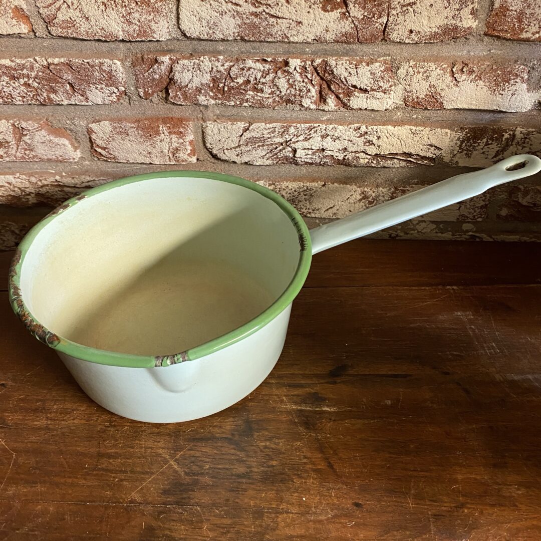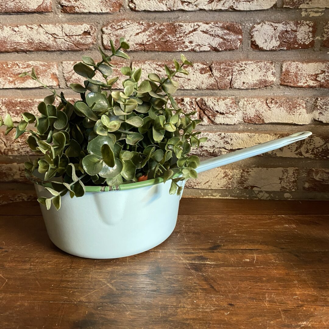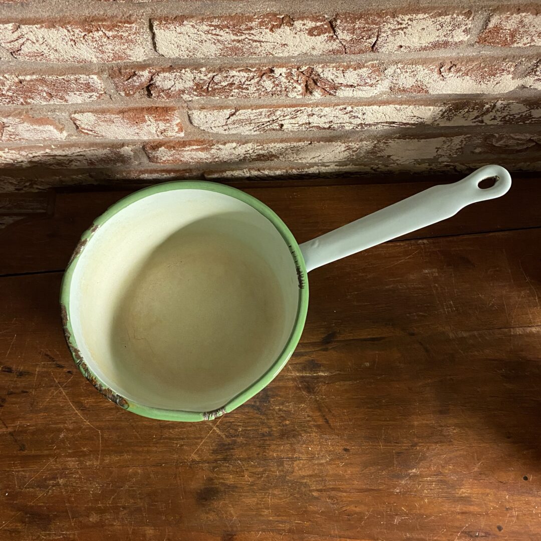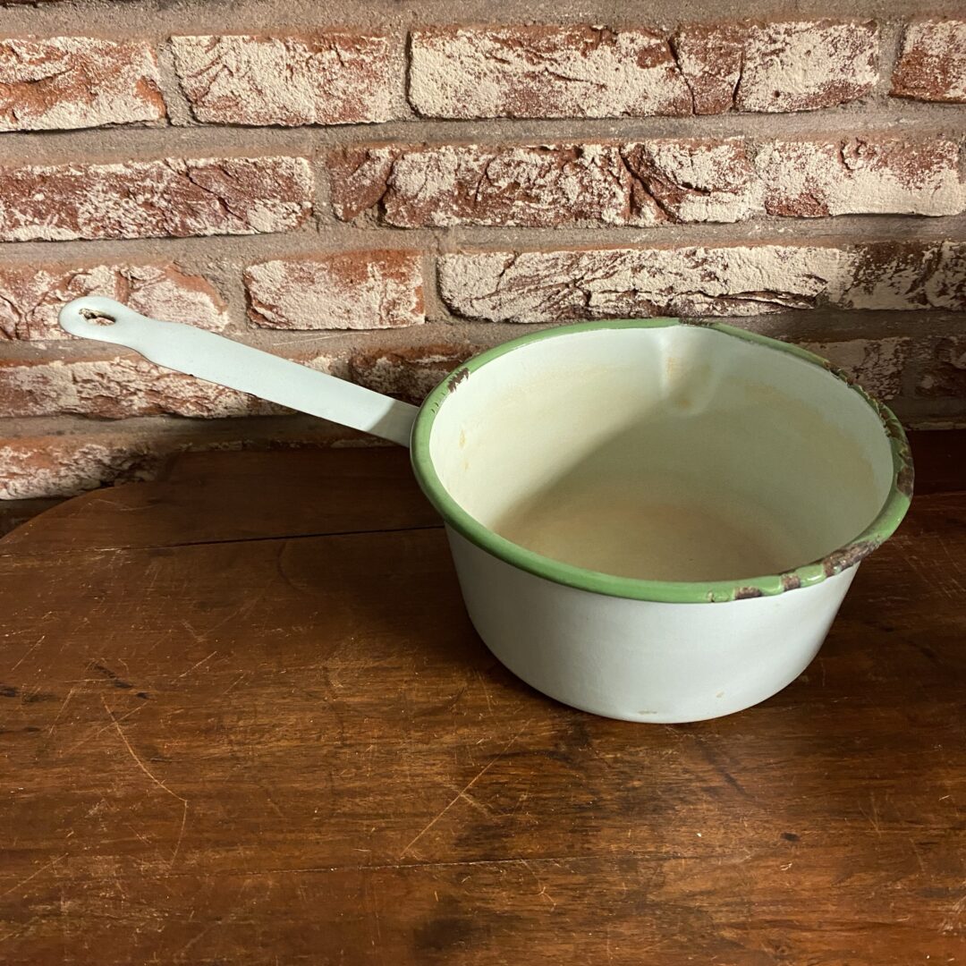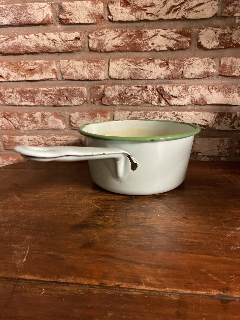 Emaille steelpan in de kleur mintgroen met donkerder groene rand. Leuk voor binnen én buiten!