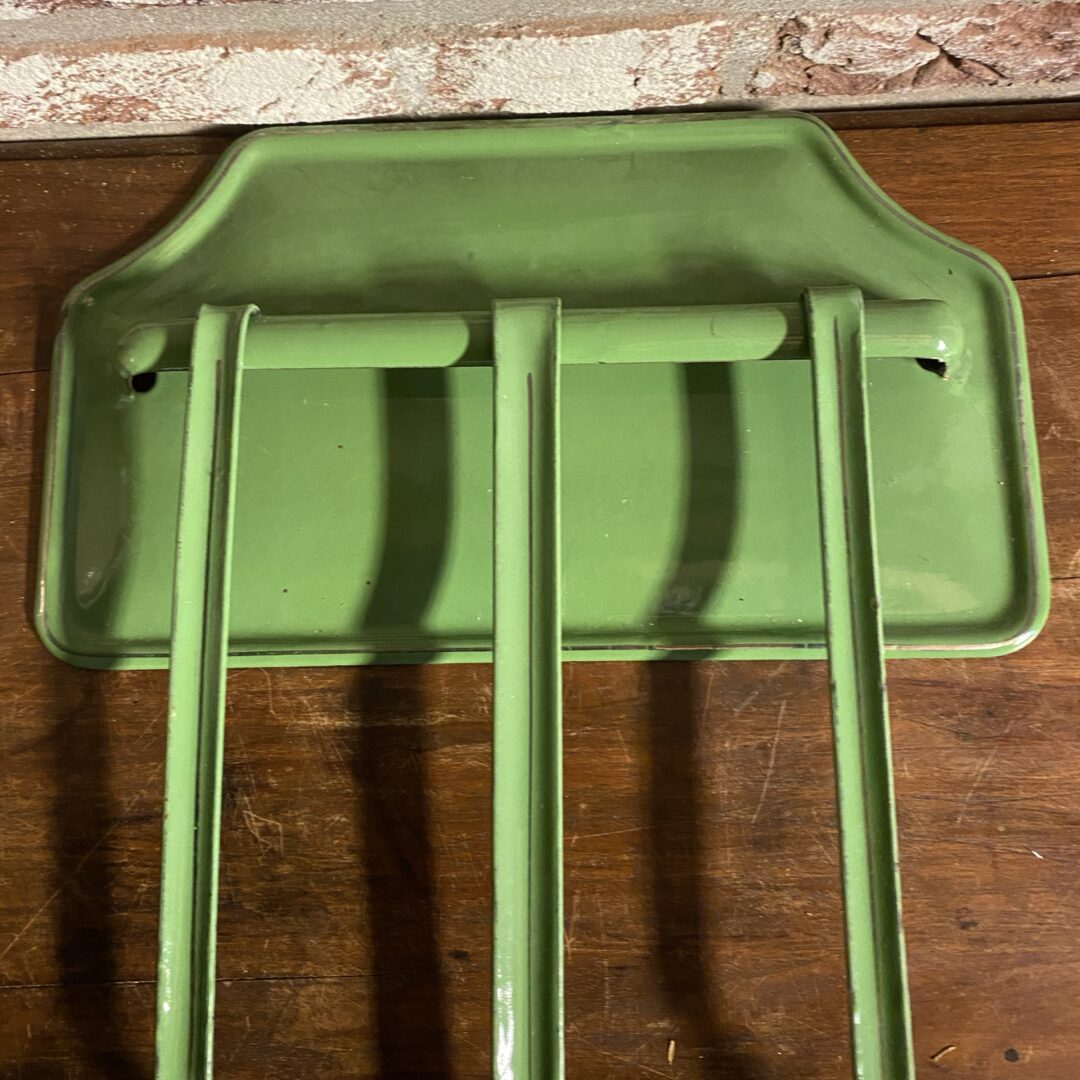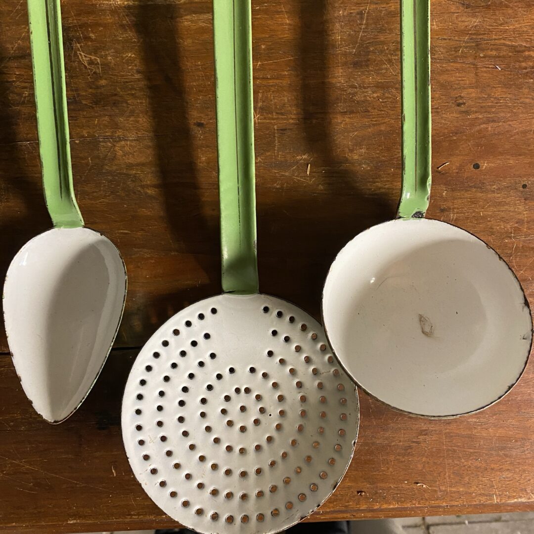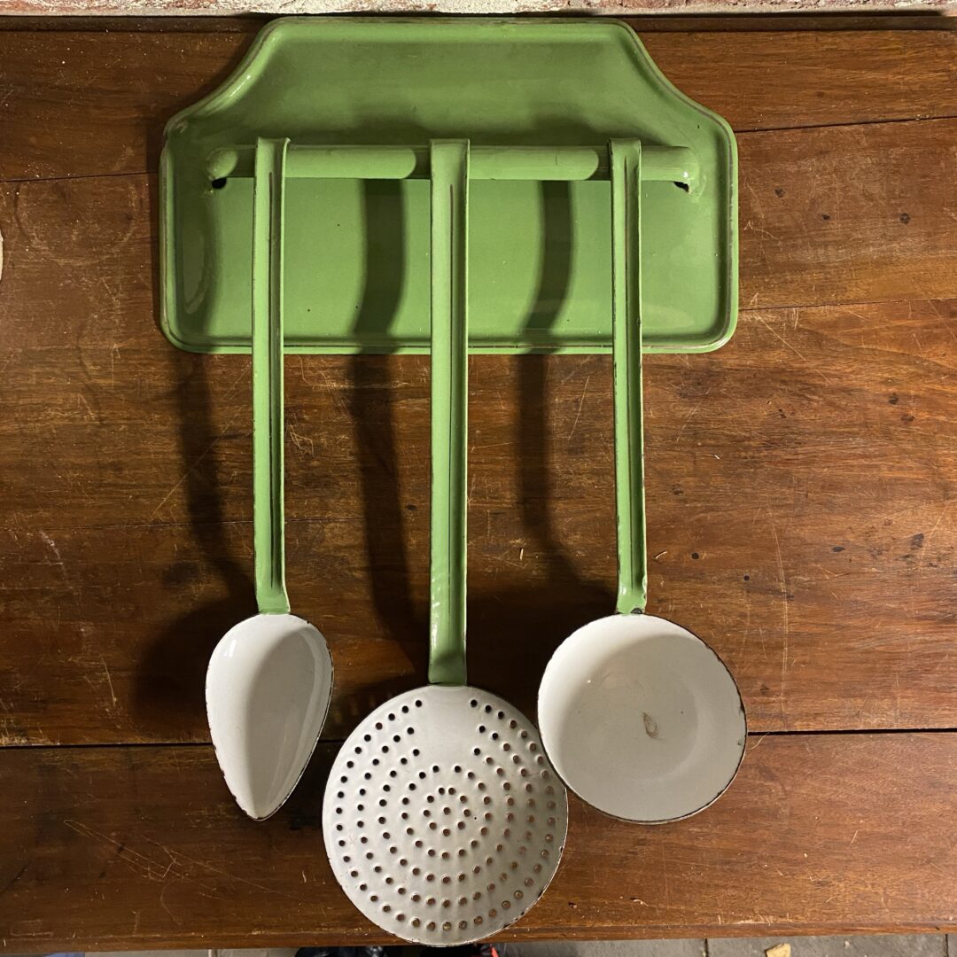 Mooi groen / wit email lepelrek / set van keukengerei, bestaande uit een schuimspaan, soeplepel en een opscheplepel, compleet met een bijpassend rekje om ze aan op te hangen. De set is uitgevoerd in een mooie groene kleur met witte accenten. Een prachtige decoratie voor de landelijke keuken en een functionele toevoeging voor de liefhebber van authentieke keukenspullen. De set vertoont gebruikssporen die passen bij de leeftijd, wat bijdraagt aan de vintage uitstraling.