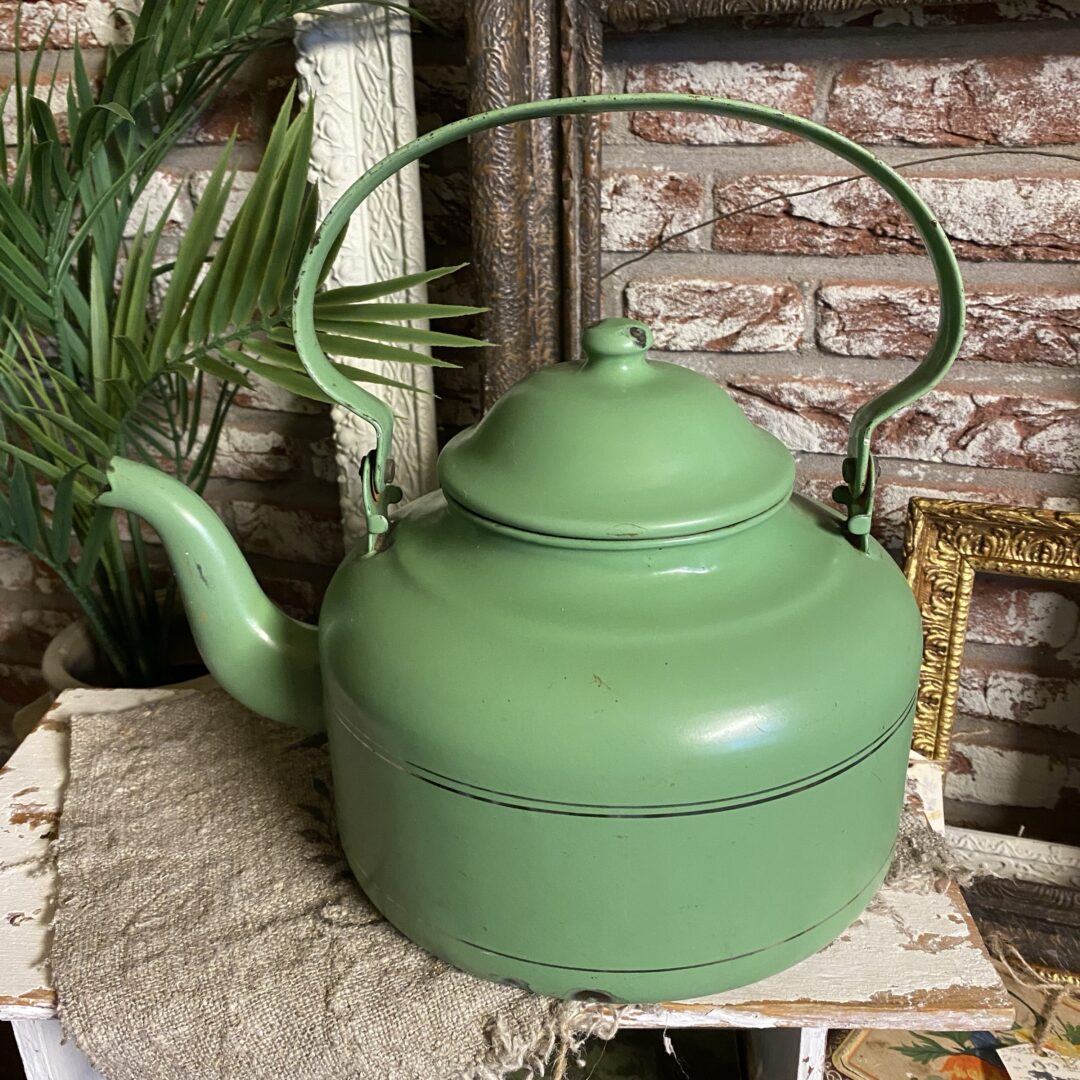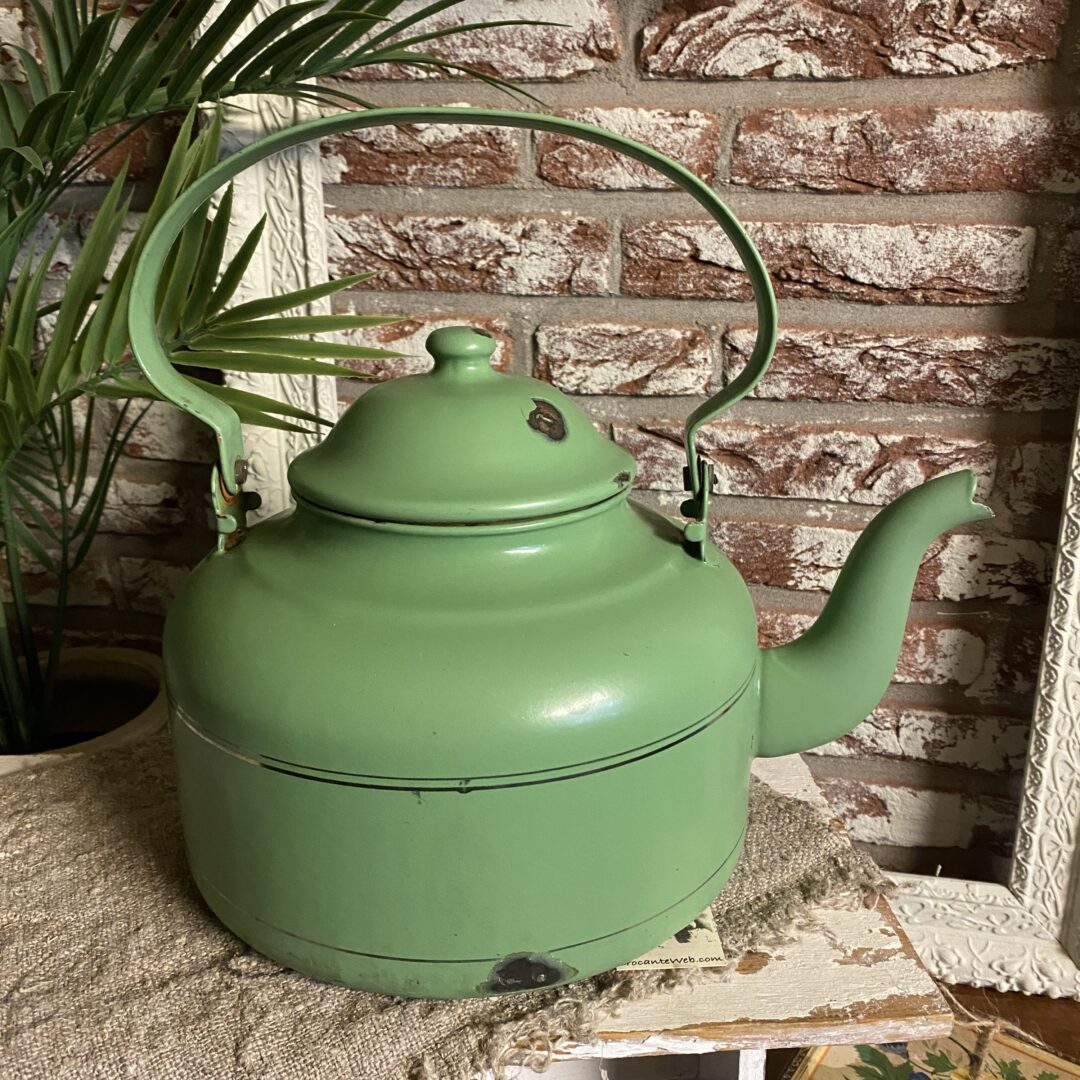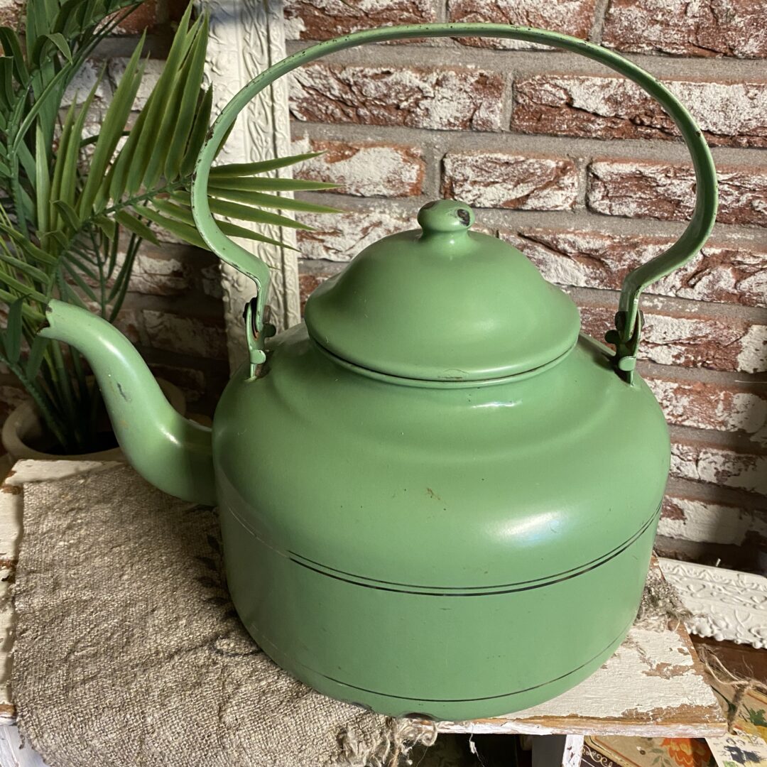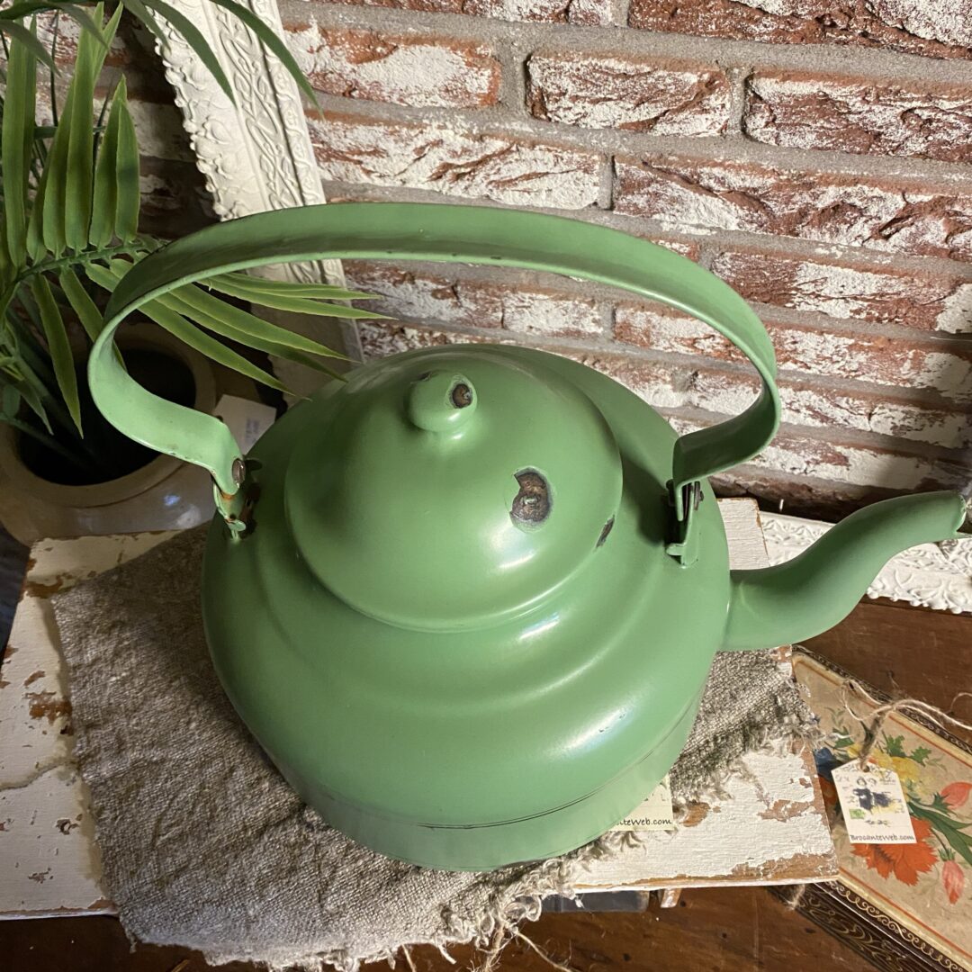 Charmante groene geëmailleerde theepot. Deze mooie matte oude theepot is een mooie toevoeging aan elke verzameling of keuken. De pot heeft een mooie groene kleur en heeft natuurlijk gebruikerssporen, gezien zijn leeftijd. Perfect voor decoratie.. leuk op fornuis, aanrecht, op regaal, of met wat leuke takken of (kunst) bloemen (je kan er vrij makkelijk een vaasje in zetten) op de keukentafel!