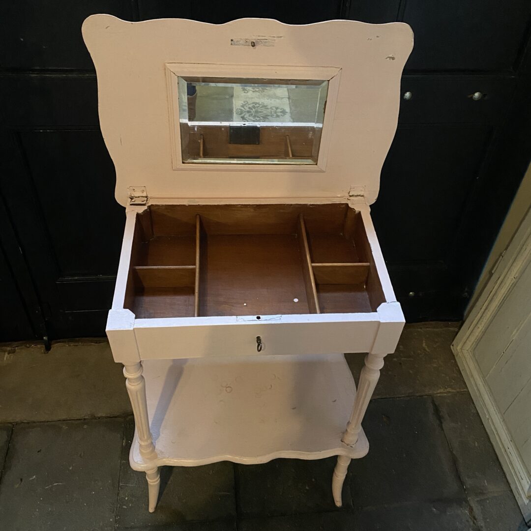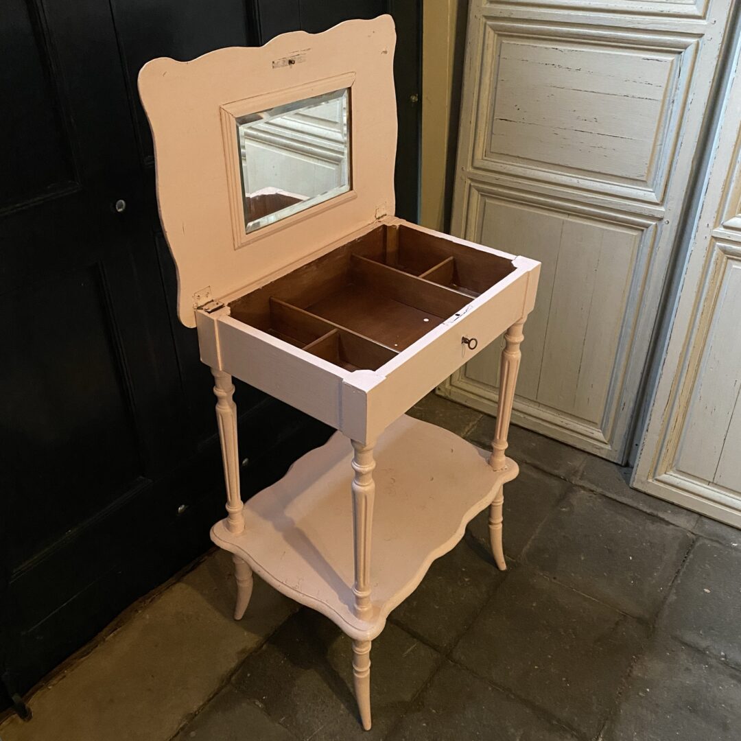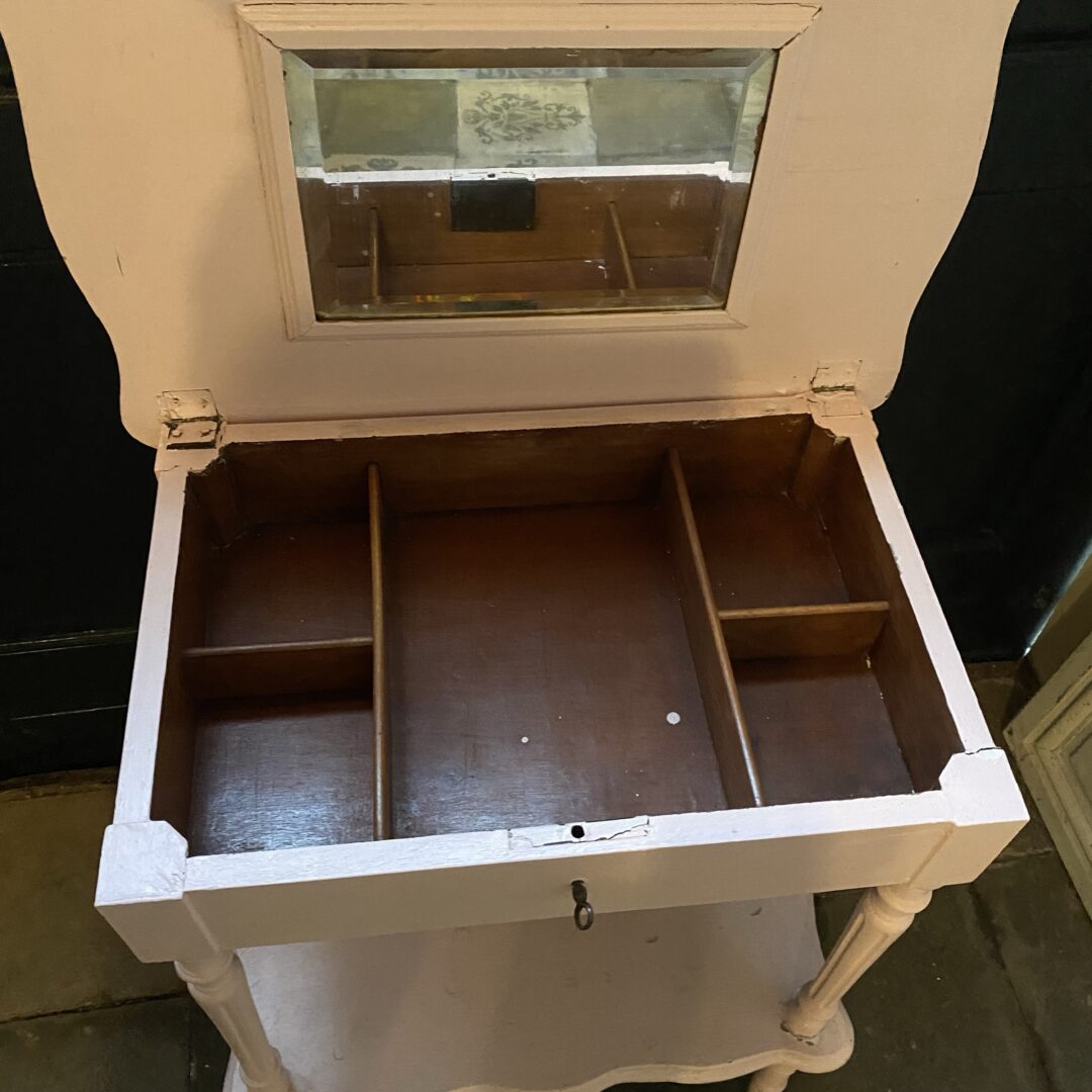 Onder de klep zit een facet geslepen spiegel en handige vakjes voor het ordenen van je spulletjes.
