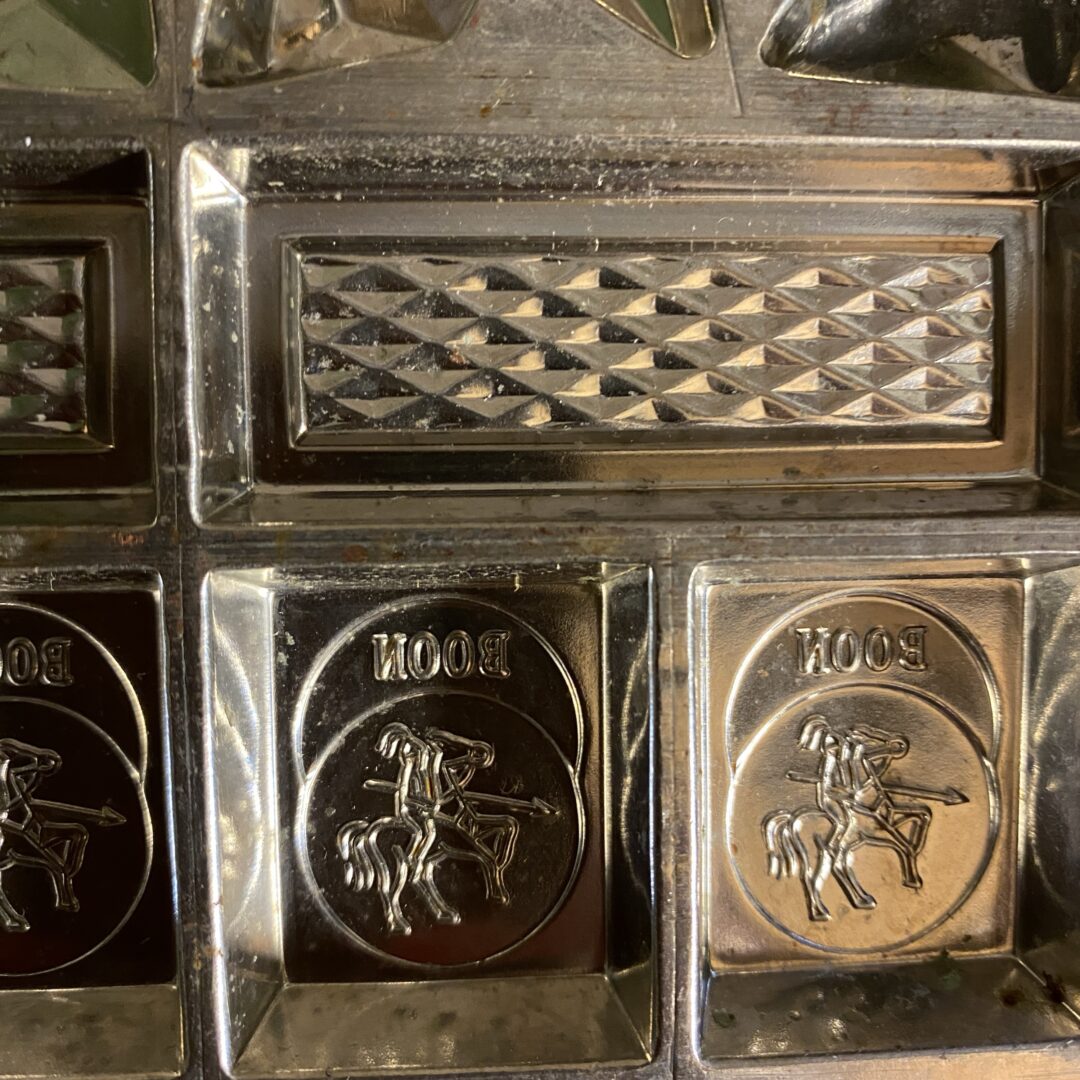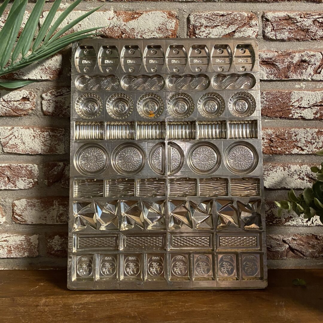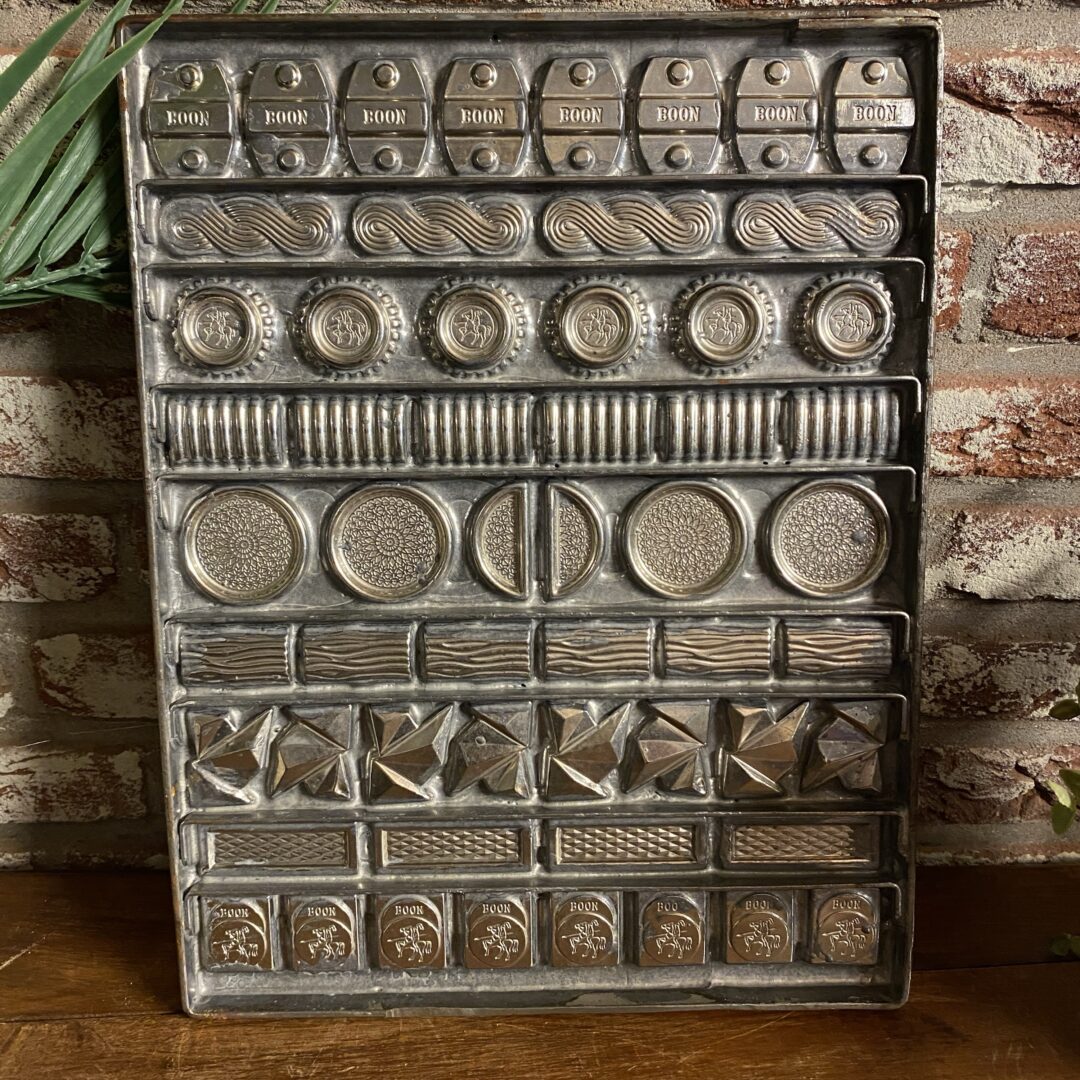 Leuke oude metalen chocoladevorm, voor 56 bonbons,  in zeer goede staat. Deze specifieke vorm bevat meerdere holtes met diverse patronen waaronder de tekst “Boon” en gedetailleerde decoratieve vormpjes.