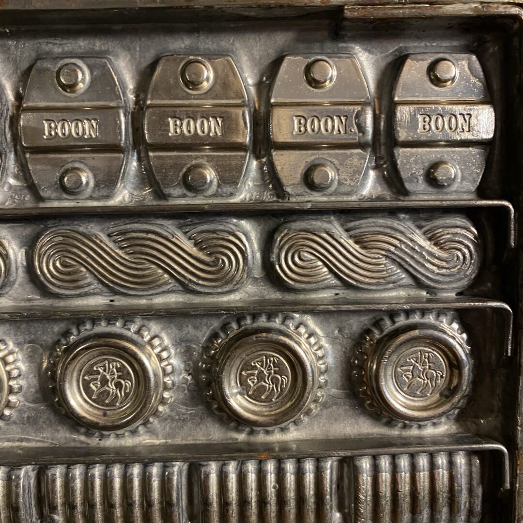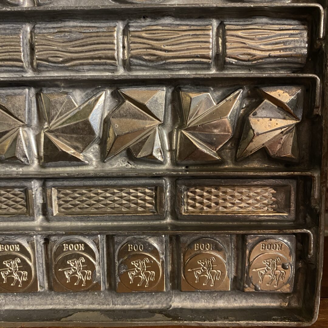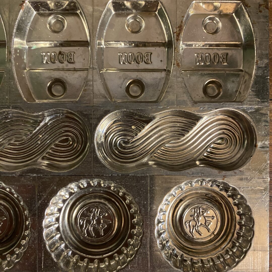 Leuke oude metalen chocoladevorm, voor 56 bonbons,  in zeer goede staat. Deze specifieke vorm bevat meerdere holtes met diverse patronen waaronder de tekst “Boon” en gedetailleerde decoratieve vormpjes.
