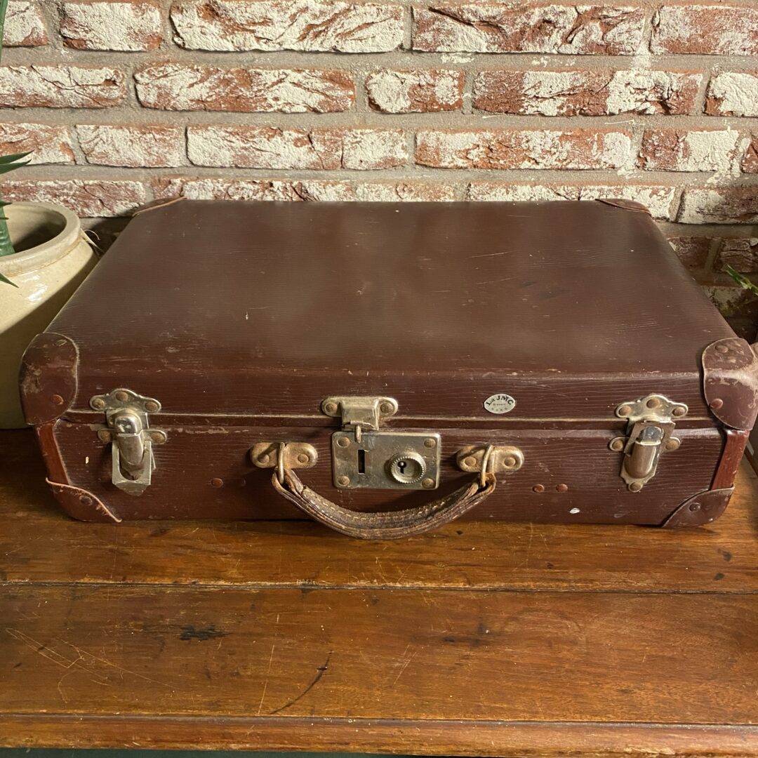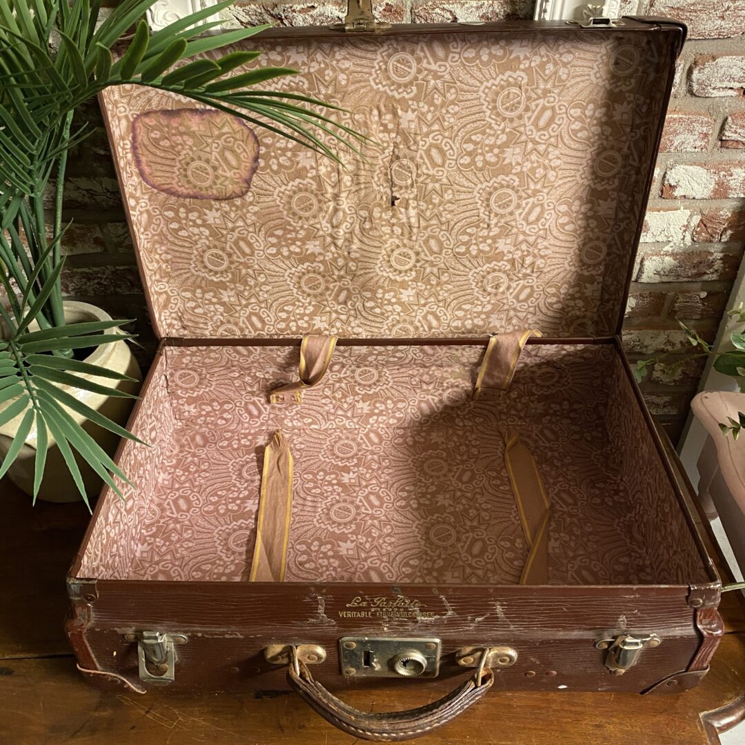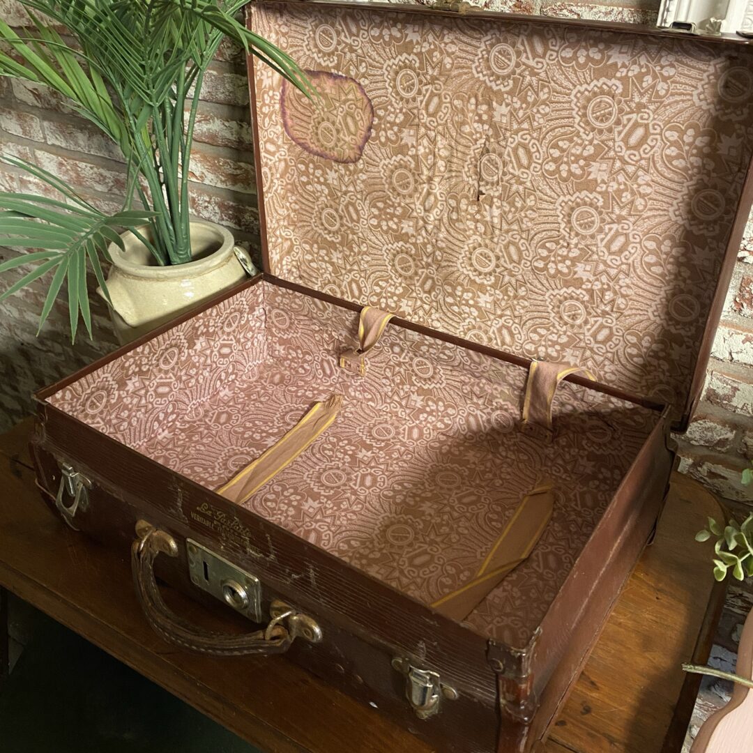 Oud bruin koffertje met originele bekleding. Leuk om spullen in op te ruimen en/of mee te decoreren.