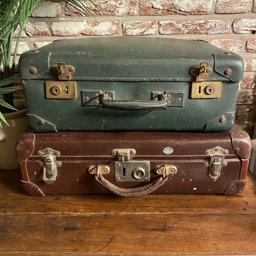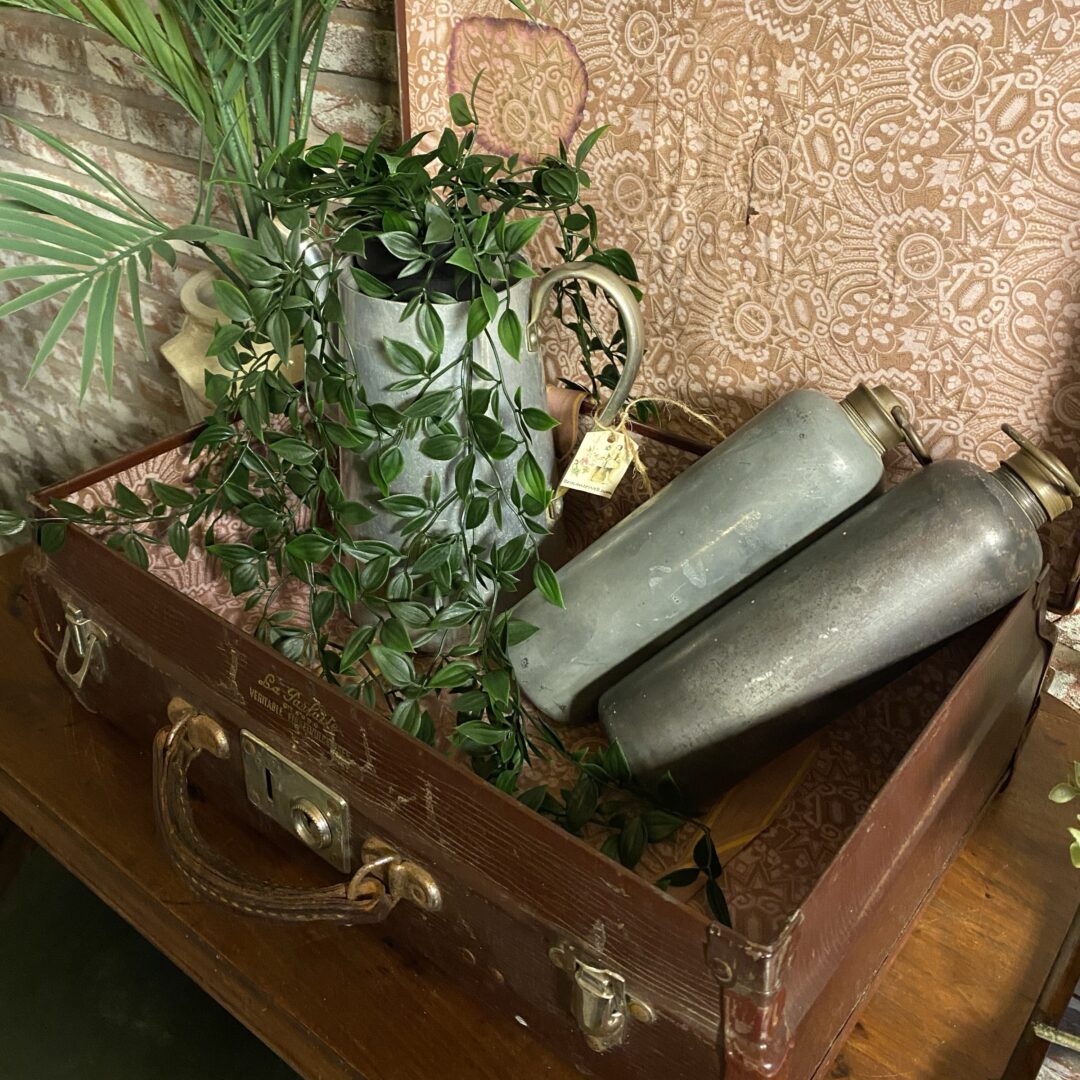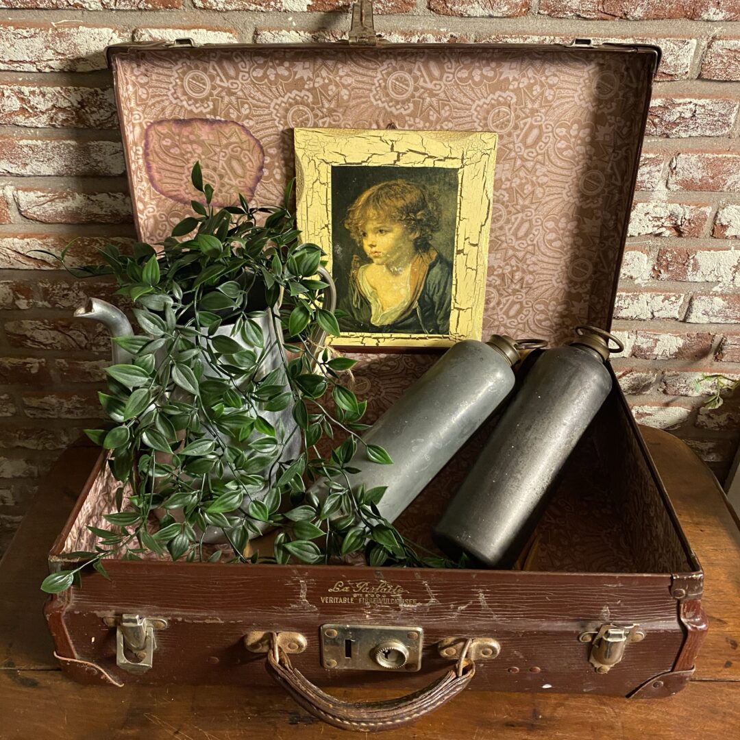 Oud bruin koffertje met originele bekleding. Leuk om spullen in op te ruimen en/of mee te decoreren.