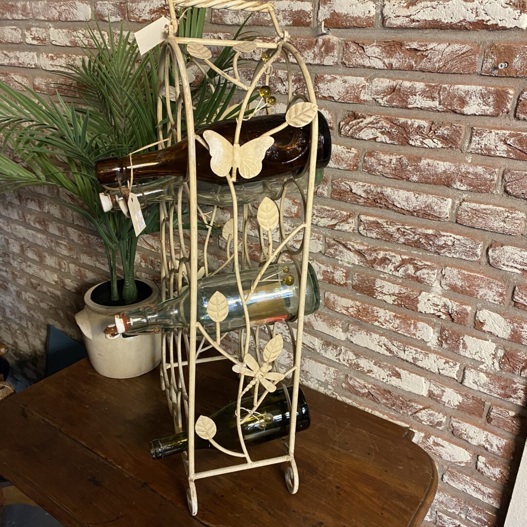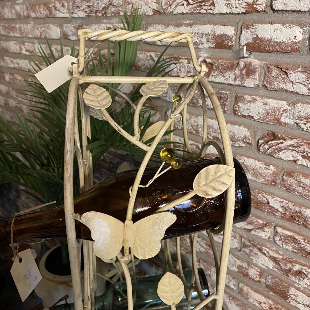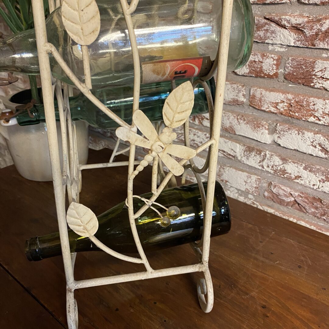 Brocant wijnrek met leuke metalen vlinder, libelle en blaadjes aan zijkant.