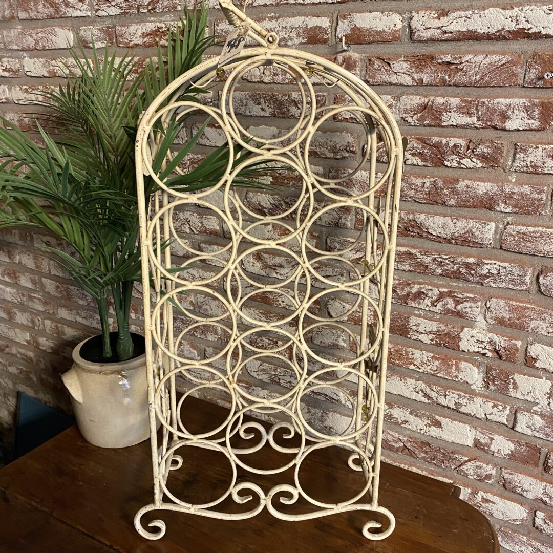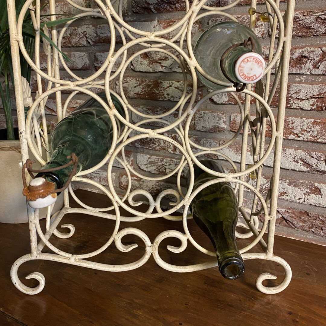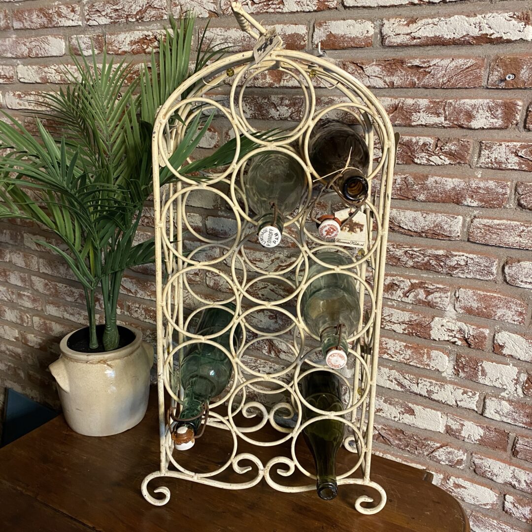 Brocant wijnrek met leuke metalen vlinder, libelle en blaadjes aan zijkant.