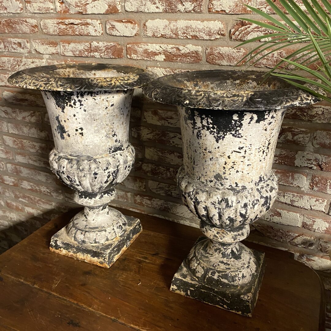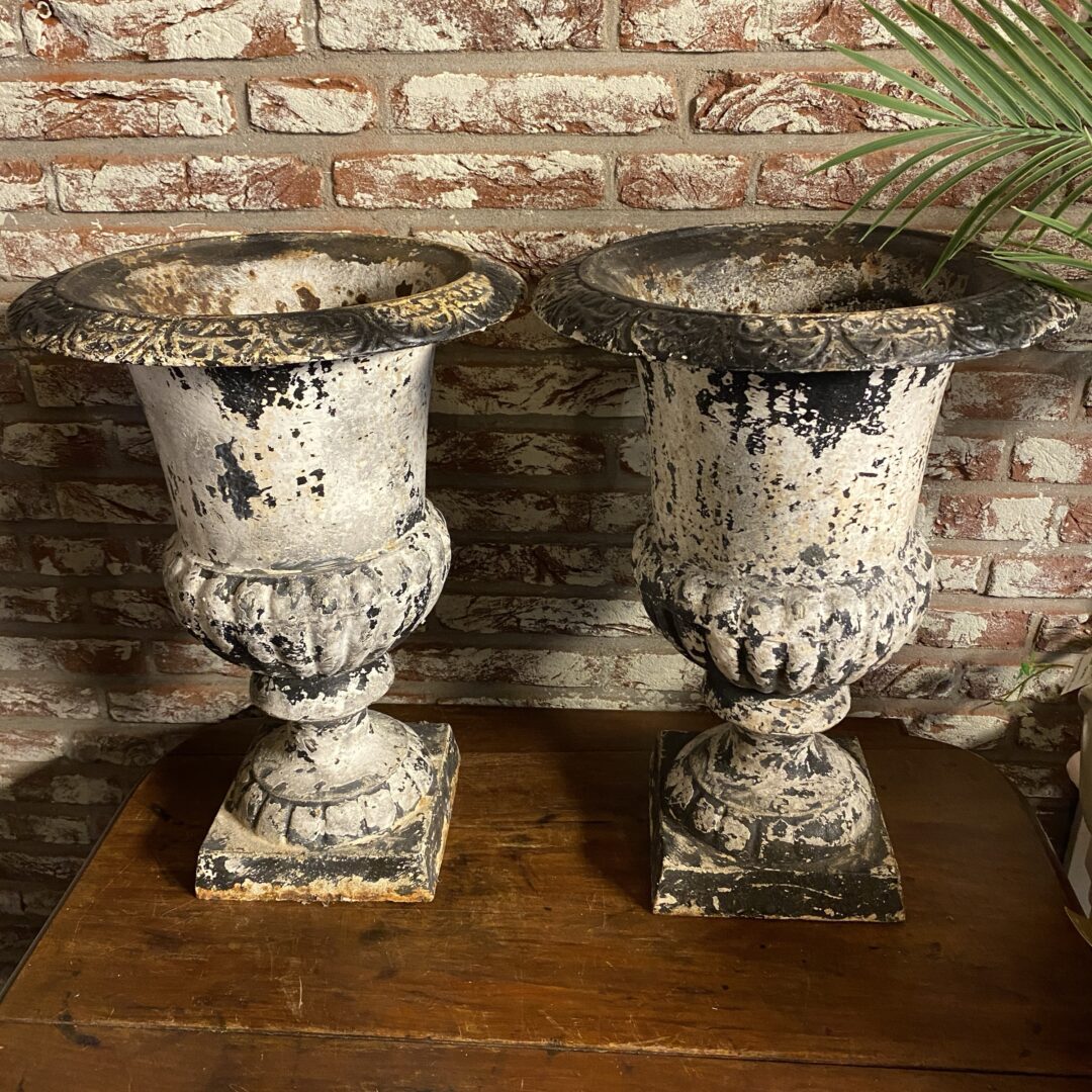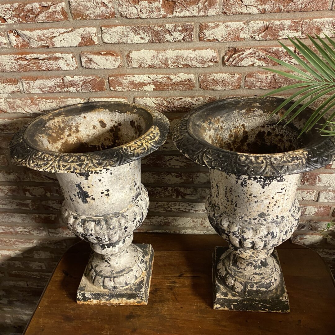 Gietijzeren Louvre bloempot, zwaar en sleets. Leuk in de vensterbank, alleen of als set. Ook op de tuintafel met plantjes of (kerst)boompjes erin een prachtige eyecatcher.
