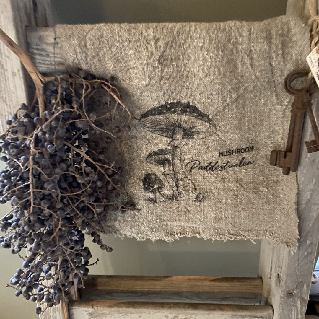 Dit shabby doekje met mooie print ‘Mushrooms’ is leuk om in de keuken (over handvat oven) te hangen, over een dienblad, olijfbak, kruik, ladder, trog of schaal. Ook leuk om een toef groen heen te wikkelen.