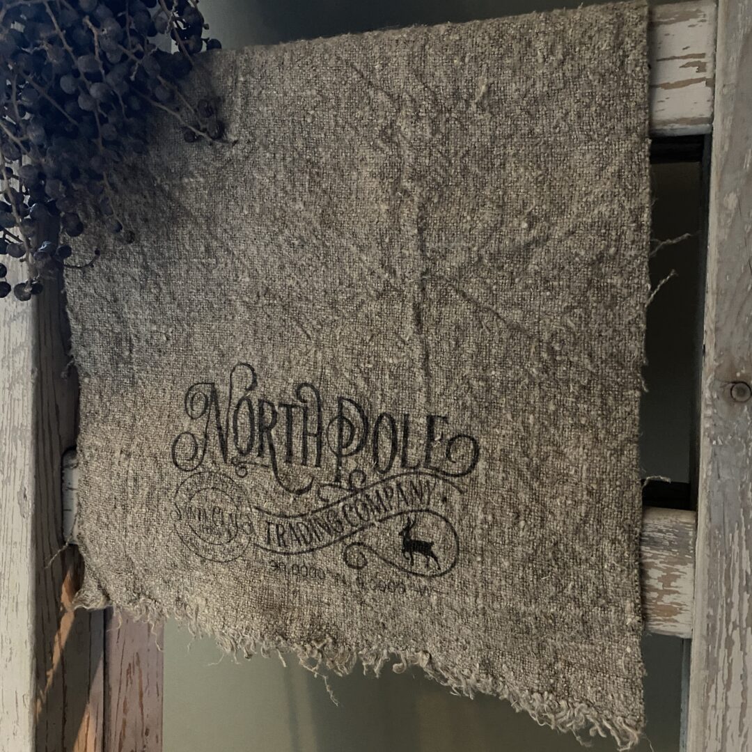 Dit stoere shabby decoratiedoek met mooie ‘Northpole’ print is leuk over een dienblad, olijfbak, kruik, ladder, trog of schaal. Ook leuk om om een toef groen heen te wikkelen.