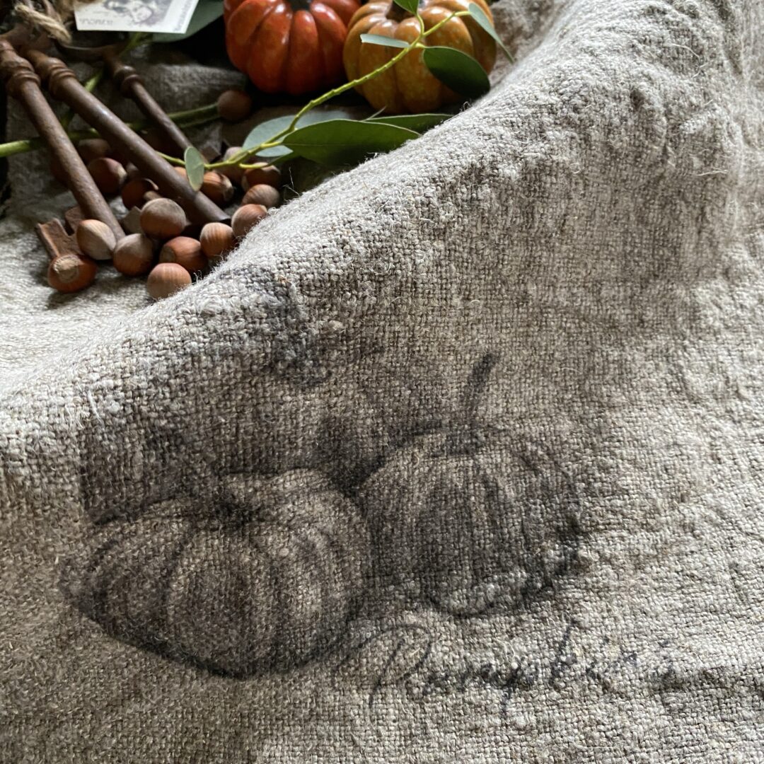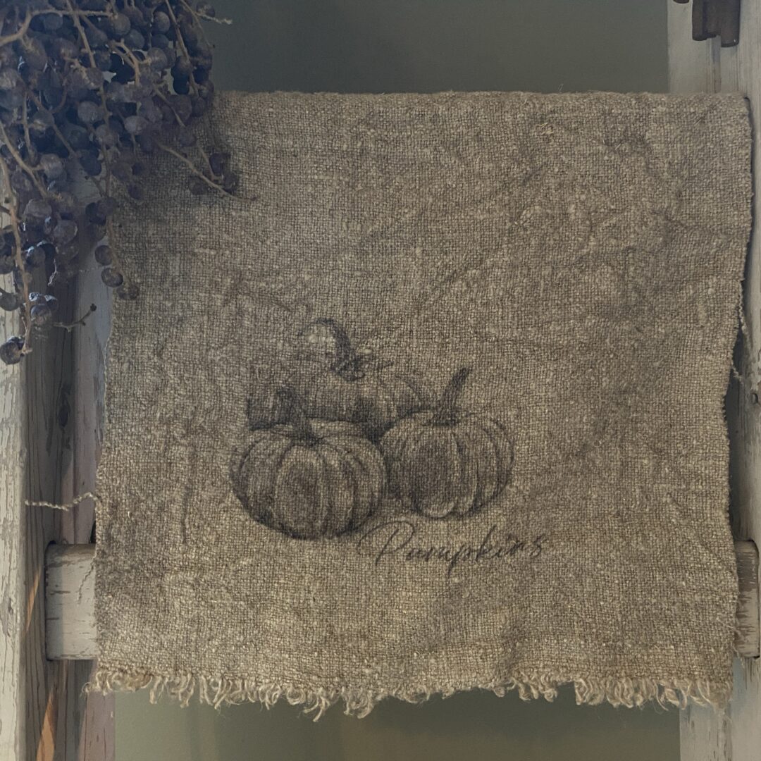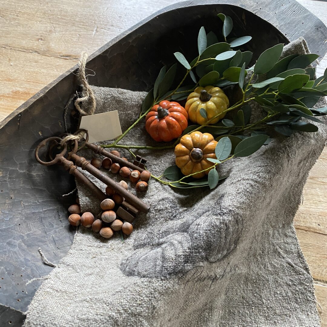 Dit shabby doekje met mooie print ‘Pumpkins’ is leuk over het handvat van de oven, over een dienblad, olijfbak, kruik, ladder, trog of schaal. Ook leuk om een toef groen heen te wikkelen.