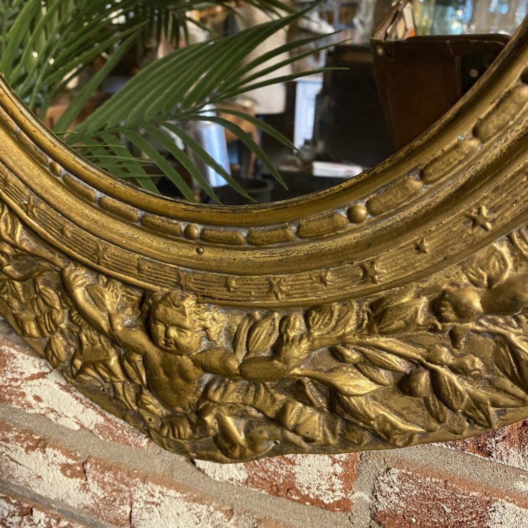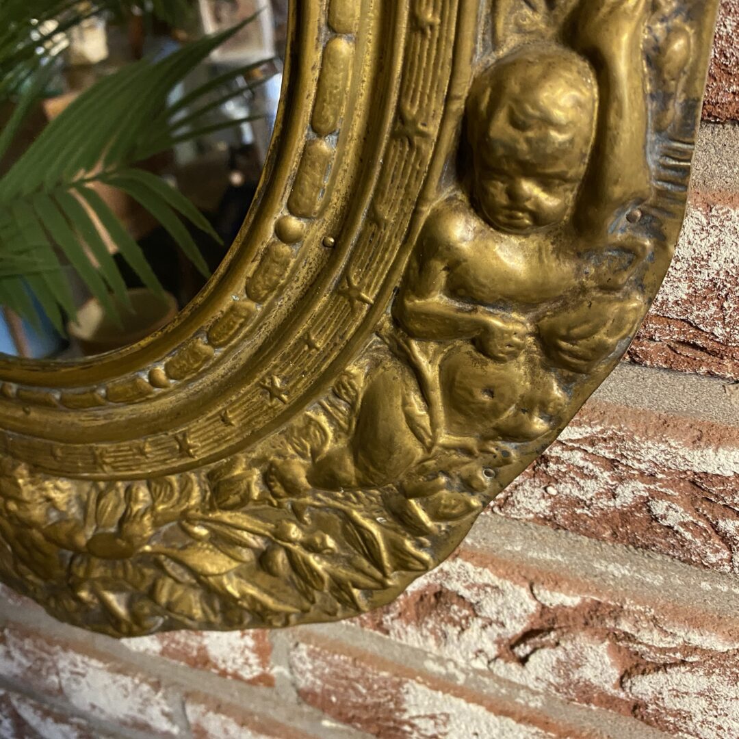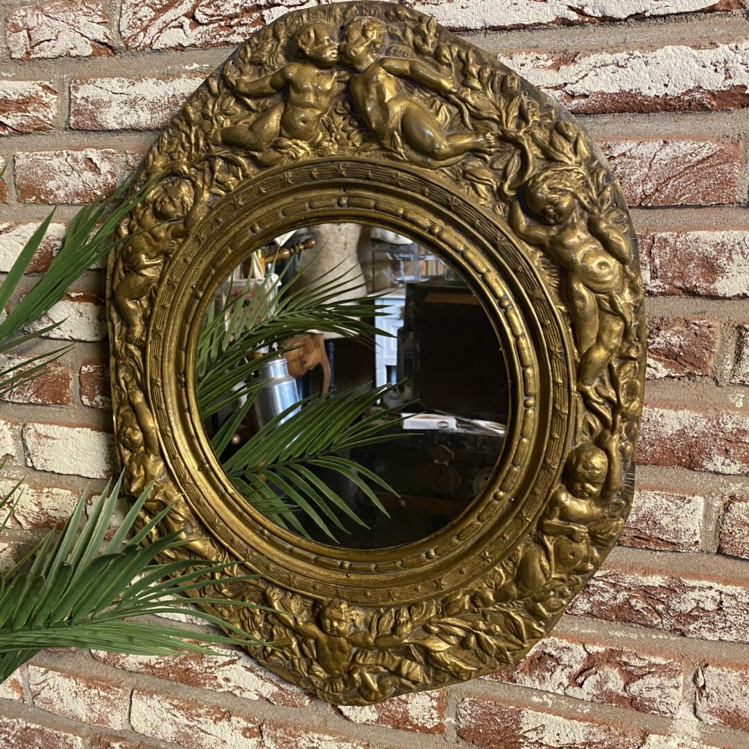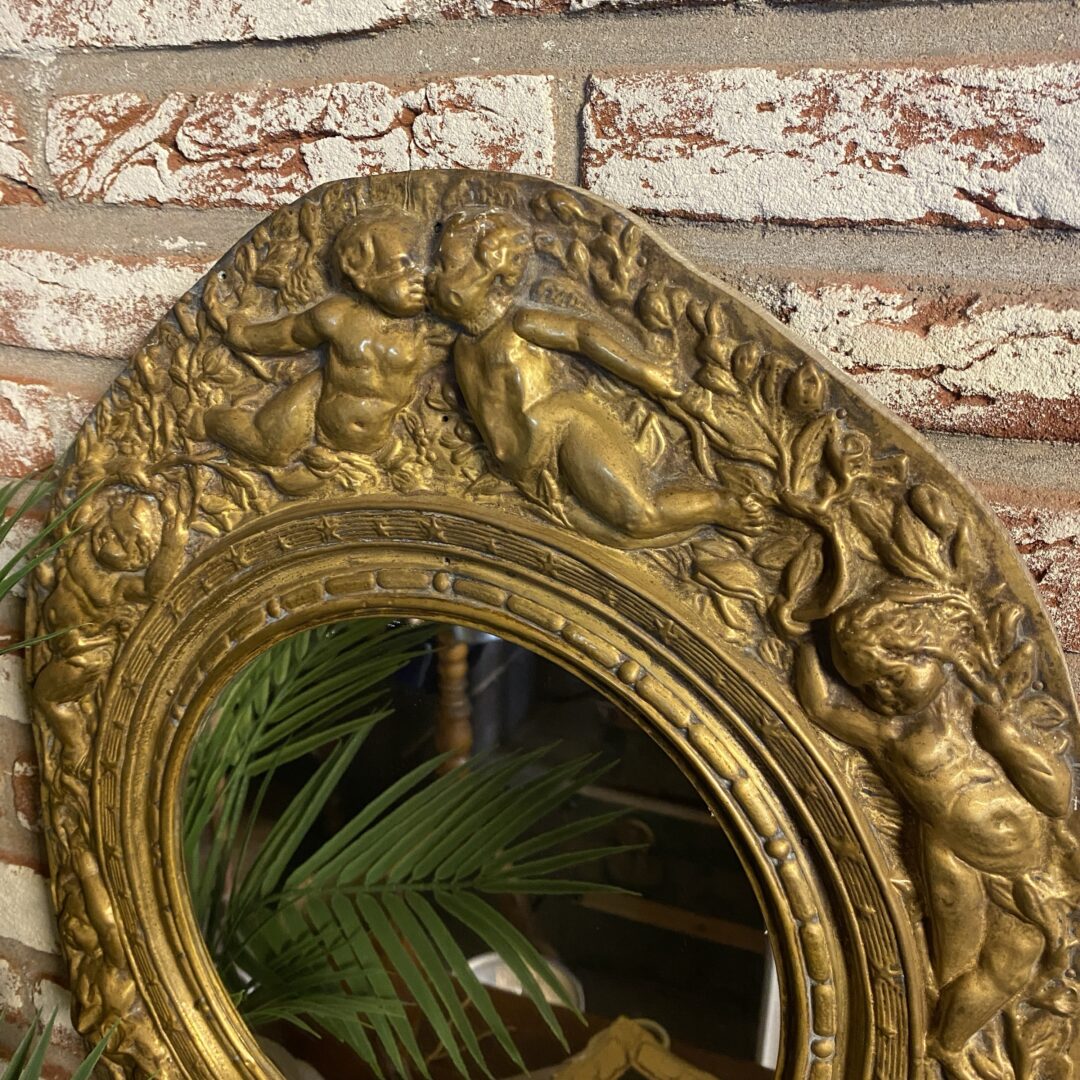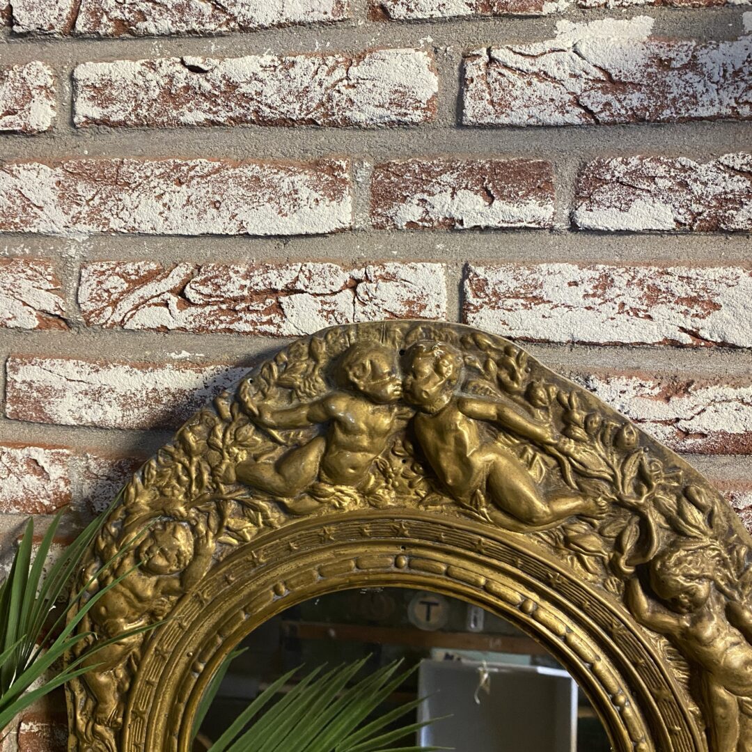 Deze spiegellijst is handgezaagd waardoor hij niet keurig netjes ovaal is, maar dat heeft ook juist weer de charme! Prachtige engelen!